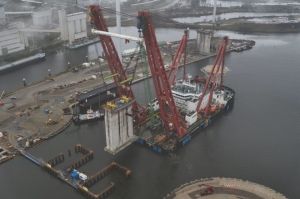 Foto 1. Plaatsing van de zuidelijke pijler met kraanschip Gulliver (foto: Van Hattum en Blankevoort / Drone Addicts)