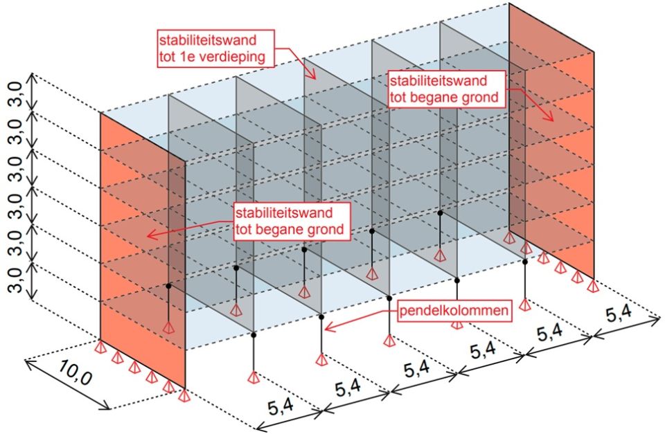 Door de pendelkolommen op de begane grond kunnen de horizontale belastingen op de stabiliteitswanden op de middenassen niet tot de begane grond worden doorgezet en zullen deze door de vloeren worden getransporteerd naar de eindwanden. Hiervoor wordt het buigend moment in de tussenwand ontbonden in twee verticale belastingen in de twee kolommen.
