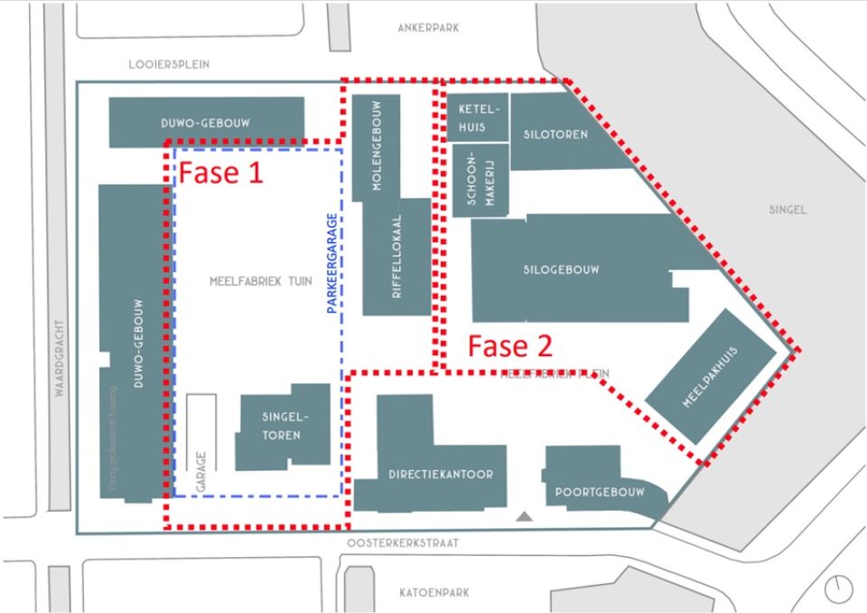 Figuur 3. Plattegrond van het Meelfabriekcomplex. In dit artikel worden de parkeergarage en de Singeltoren beschreven
