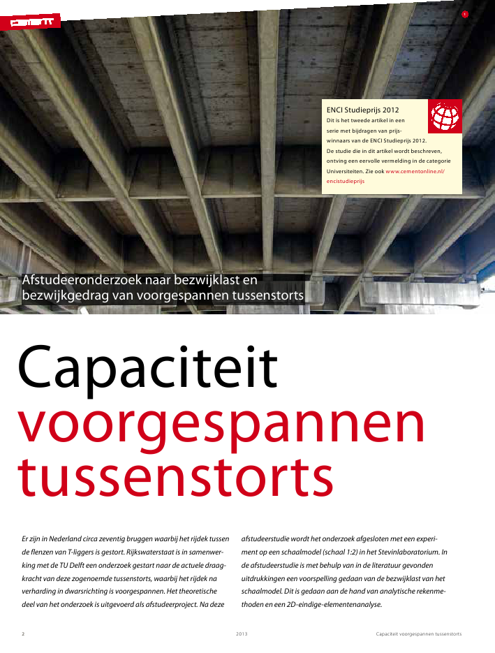Er zijn in Nederland circa zeventig bruggen waarbij het rijdek tussen de flenzen van T-liggers is gestort. Rijkswaterstaat is in samenwerking met de TU Delft een onderzoek gestart naar de actuele draagkracht van deze zogenoemde tussenstorts, waarbij het rijdek na verharding in dwarsrichting is voorgespannen. Het theoretische deel van het onderzoek is uitgevoerd als afstudeerproject. Na deze afstudeerstudie wordt het onderzoek afgesloten met een experiment op een schaalmodel (schaal 1:2) in het Stevinlaboratorium. In de afstudeerstudie is met behulp van in de literatuur gevonden uitdrukkingen een voorspelling gedaan van de bezwijklast van het schaalmodel. Dit is gedaan aan de hand van analytische rekenmethoden en een 2D-eindige-elementenanalyse. Auteurs:ir. Mark Vugts (Arcadis)dr.ir. Cor van der Veen (TU Delft, fac. CiTG)