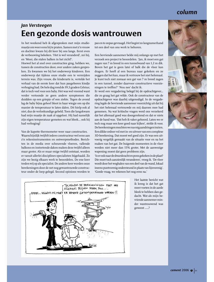 columncement 2006 7 21In het weekend heb ik afgesproken met mijn studie-maatjeomweereensbijtepraten.Samenmetz'nvrouwen dochter kwam hij dit keer bij ons langs. Eerst evende verbouwing bekeken. `Het is wel veranderd', zei hij,en `Mooi, die stalen balken in het zicht!'.Hoewel het al snel over constructies ging, hebben we,tussen de constructies door, over andere zaken gespro-ken. Zo kwamen we bij het onderwerp kinderen. Eenonderwerp dat tijdens onze studie een te vermijdenterrein was. Zijn vrouw, die kinderarts is, vertelde hetverhaal van de eerste keer dat hun pasgeboren kindjeverhoginghad.Deheledagrondde39,5gradenCelsius;dat is toch veel voor een baby. Het was wel vreemd wantverder vertoonde ze geen andere symptomen dieduidden op een griepje of een ziekte. Tegen de avondlag de baby bijna geheel bloot in haar wiegje om op diemanier de temperatuur te laten dalen. Dit hielp ook alniet, dus de verloskundige gebeld. Toen die langskwamhad mijn maatje de zaak al opgelost. Hij had namelijkzijn eigen temperatuur gemeten en wat bleek... ook hijhad verhoging!Van de kapotte thermometer weer naar constructies.Waarschijnlijk twijfelt iedere constructeur wel eens aanz'n rekeninstrumenten en ontwerpmethodes. Berich-ten in de media over scheurende vloeren, vallendebalkons en instortende daken maken deze twijfel alleenmaar groter. Als er maar enige twijfel ontstaat, wordener vanuit allerlei disciplines specialisten bijgehaald. Zozijn we bezig elkaars werk te beoordelen. De ene keertreden wij op als specialist. De andere keer worden onzeberekeningen door de net nog gewantrouwde construc-teur onder de loep gelegd. Second opinions worden tepas en te onpas gevraagd. Het begint zo langzamerhandtot een deel van ons werk te behoren.Een bevriende aannemer belde mij onlangs op met hetverzoek een project te beoordelen. `Jan, ik moet een gatzagen van 7 m breed in een tunnelwand van 1,2 m dik.Boven het gat is geen latei of balk die de vloer kandragen. Er heeft al een bureau naar gekeken en zezeggen dat het kan, maar ik vertrouw het niet helemaal.Je kunt toch niet zomaar een gat van 7 m breed zagenin een tunnel, zonder daarvoor constructieve voorzie-ningen te treffen?' `Nou nee' dacht ik.Er werd een vergadering belegd bij de opdrachtgever...die zo graag het gat wilde. Ook de constructeur van deopdrachtgever was daarbij uitgenodigd. In de vergade-ring legde de bevriende aannemer voorzichtig uit dat hijhet niet helemaal vertrouwde en mij daarom mee hadgenomen. Na wat kritische vragen werd ons verzekerddat het allemaal goed was doorgerekend en dat er nietsaan de hand was. `Dat heb ik vaker gehoord. Laten we ertoch nog maar een keer goed naar kijken', stelde ik voor.Deberekeningenmochtenwenaenigaandringeninzien.Eendikkeordnervolmetin-enuitvoervaneencomplexe3D-berekening. Dat moest wel goed zijn. Er was een uit-voerig vergelijk gemaakt van de situatie voor en na hetmaken van het gat. De buigende momenten in de vloerwerden niet meer dan 15% groter. Met de aanwezigewapening moest dat geen probleem zijn.`Iserooknaardedwarskrachtenponsgekekenindeplaat?Die moet toch aanzienlijk veranderen', vroeg ik. `De vloerwordt door het weghalen van een deel van de wand, lokaalineenspuntvormigondersteundinplaatsvanlijnvormig'.`Goede vraag, we rekenen het nog eens na.'Het laatste bericht watik kreeg is dat het gatmeer voeten in de aardebleek te hebben dan ge-dacht. Wat als mijn be-vriende aannemer min-der wantrouwend wasgeweest .....? nJan VersteegenEen gezonde dosis wantrouwen