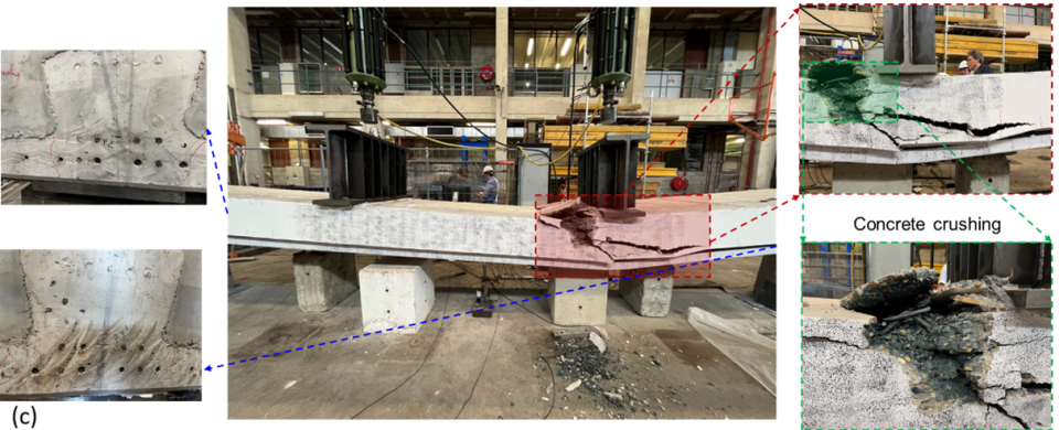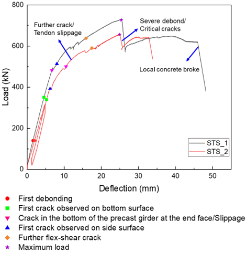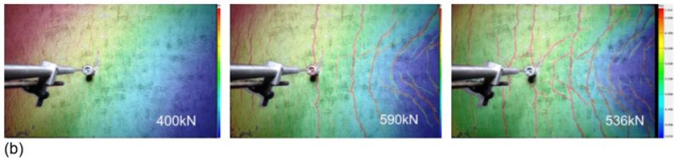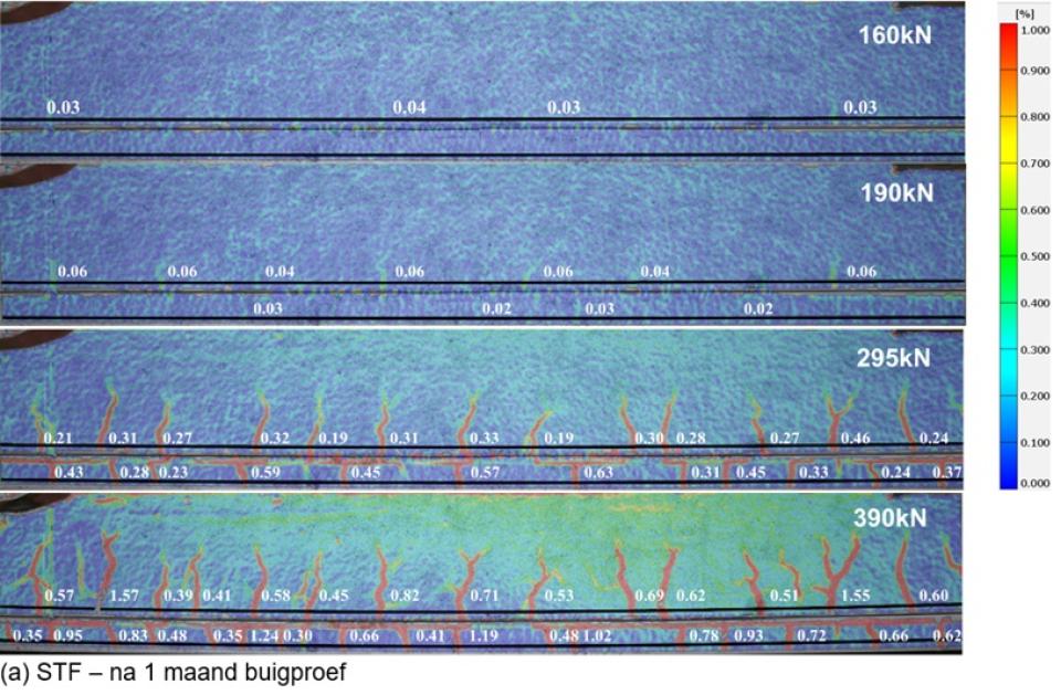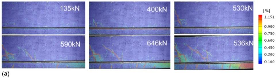 De proefstukken gedroegen zich lineair in de beginfase. Bij 135 kN werden rekconcentraties waargenomen ter hoogte van de aanhechting tussen de prefab ligger en de druklaag (fig. 15a). Er ontstonden geringe buigscheuren in het ondervlak van de prefab ligger, gevolgd door een delaminatie tussen de prefab ligger en druklaag en een grotere scheur in de druklaag bij circa 400 kN (fig. 15b). De stijfheid verminderde aanzienlijk na het ontstaan van de afschuivingsscheur. Met toename van de belasting werden de scheuren langer en werd het slippen van de voorspanstrengen duidelijk. STS_1 en STS_2 bereikten de maximale belasting van 728 kN en 658 kN.