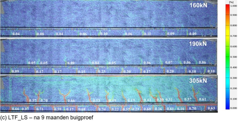Het scheurmoment van LTF_LS was 40 kN. De kleine scheuren waren waarschijnlijk al veroorzaakt door de aanhoudende belasting.