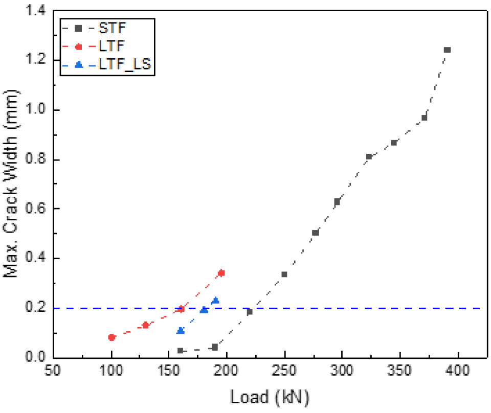 Figuur 12 geeft de relatie tussen scheurwijdte en belasting. Voor LTF en LTF_LS zijn de scheurwijdtes tot 190 kN meegenomen, totdat ontlastingscycli werden toegepast. De scheurwijdte van 0,2 mm [11] in STF werd bereikt bij 220 kN. Dit is aanzienlijk hoger dan het berekende bruikbaarheidsbelastingsniveau voor een enkele ligger (~130 kN). Daarentegen bereikte de maximumscheurwijdte van LTF en LTF_LS de grenswaarde eerder, namelijk bij resp. 160 kN en 180 kN.