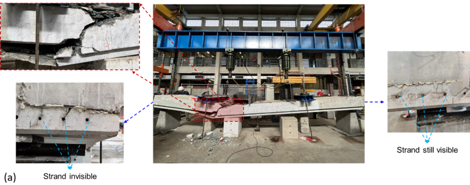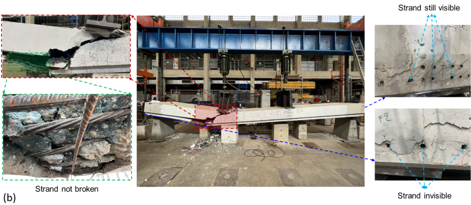 Figuur 12a, 12b en 12c tonen de bezwijktoestanden van respectievelijk STF_R2, LTF en LTF_LS. In de LTF bezweek de verankering (slippen van de strengen) bij een belastingsniveau van 381 kN. Voor de opnieuw geteste STF_R2 werd een vergelijkbaar gedrag waargenomen. Door het gecombineerde effect van de belastingscycli met hoge belastingsniveaus en vermindering van materiaaleigenschappen op de lange termijn (zie verderop), bezweek de opnieuw geteste ligger STF_R2 op 372 kN zonder het belastingsniveau van de eerste test te halen. Daarentegen werd in LTF_LS bij 402 kN betonstuik waargenomen (figuur 12c), als een aanduiding van bezwijking op buiging. Het slippen van de voorspanstrengen proefstuk LTF_LS was minder significant als bij proefstuk LTF.