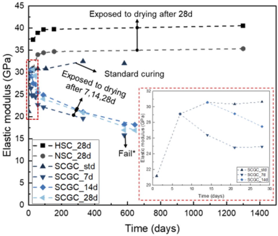 De ontwikkeling van de elasticiteitsmodulus is vergelijkbaar voor monsters die na 28, 14 en 7 dagen werden blootgesteld. Hierbij moet worden vermeld dat het proefstuk dat na zeven dagen werd gedroogd, bij de test na 580 dagen bezweek onder 40% drukspanning van fc,190d. Het is nog steeds niet duidelijk waarom. Door [9] is een vermindering van de splijttreksterkte tussen de ouderdom van twee en vijf jaar gemeld voor een op hoogovenslak gebaseerde GPB, terwijl er geen aanzienlijk effect werd waargenomen voor de langetermijndruksterkte. Deze afname werd toegeschreven aan chemische veranderingen in de microstructuur tijdens uitdroging. In alle monsters die werden blootgesteld aan uitdroging, trad een aanzienlijke vermindering van de elasticiteitsmodulus op. Verder is het niet duidelijk of, en wanneer de elasticiteitsmodulus niet meer verder terugloopt. Alhoewel het aan uitdroging gerelateerd lijkt te zijn, is het onderliggende mechanisme nog niet duidelijk.