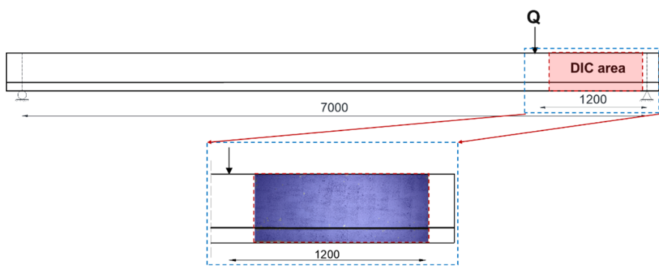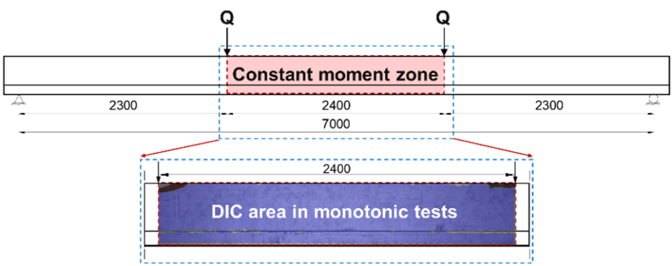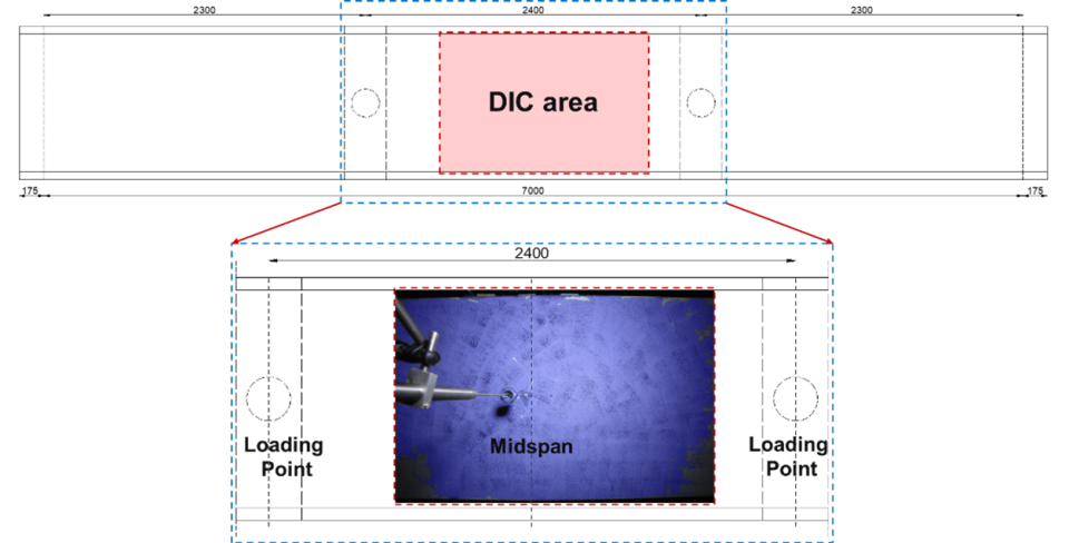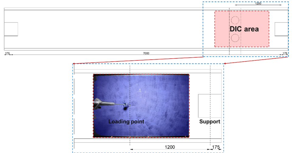 De buigproeven en de proeven met aanhoudende belasting zijn uitgevoerd onder vierpunts buiging (foto 2 en 3, fig. 4). Om de scheurontwikkeling te monitoren is Digital Image Correlation (DIC) toegepast, specifiek in de zone waar de proefstukken een constant buigend moment hadden, op het ondervlak en het zijvlak (fig. 4). Om de doorbuiging in het midden van de overspanning te meten, zijn er lineair variabele differentiaaltransformatoren (LVDT's) geplaatst aan de onderkant van de proefstukken.
