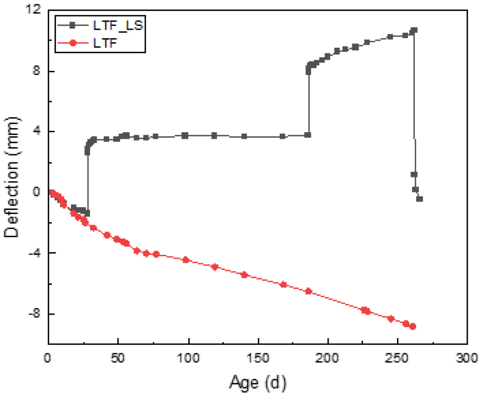 De doorbuiging van LTF_LS bereikte een plateau kort na het toepassen van 70 kN, en was daarna vrijwel constant. Er werden geen buigingsscheuren waargenomen aan de onderkant van LTF_LS. Na 186 dagen, toen de belasting werd verhoogd tot 130 kN, nam de vervorming direct toe (elastische vervorming) en bleef daarna toenemen. Tenslotte werd LTF_LS ontlast en trad herstel op van de doorbuiging.