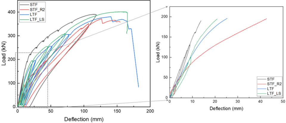 Anders dan bij STF, die slechts kleine scheuren vertoonde, lieten LTF en LTF_LS al ernstige scheurvorming zien bij het berekende bruikbaarheidsbelastingsniveau van 130 kN. Meer scheuren, met een kleinere scheurwijdte en dichter bij elkaar, zijn waargenomen in STF in vergelijking met LTF en LTF_LS.
