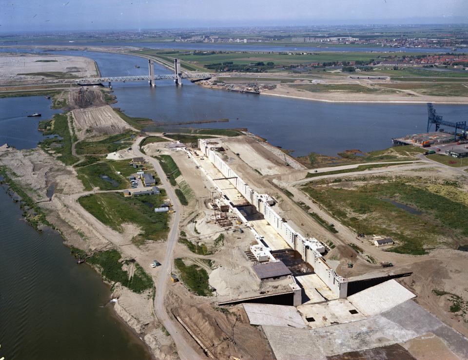 Foto 2. Bouwfase met Europoort en Botlekgebied in ontwikkeling, met links van de sluis het Hartelkanaal en aan de bovenzijde het Calandkanaal en de Brittaniƫhaven (foto: Aerocamera Bart Hofmeester / Fotobureau Roel Dijkstra)