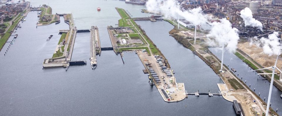 Foto 1 . Zeesluis IJmuiden met rechts onderaan de Selectieve Onttrekking (foto: Van Hattum en Blankevoort/Topview)