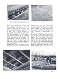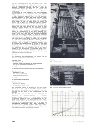 Abb. I. Muwi-WohnungenSpannbetontr?ger im holl?ndischen Wohnungsbauvon C. VerruijtDirektor der Nederlandse Spanbeton Maatschappij G.m.b.H.(N.S.M.) zu Alphen am RheinIn Holland werden von verschiedenen Bau-Unternehmungen imgrossen Umfang Wohnungen nach dem System 'Muwi' gebaut(Abb. I).Die Tragkonstruktion f?r die Decken dieser Wohnungen bestehtaus kleinen Tr?gern von Spannbeton mit Verwendung von kalt-gezogenem Stahl; ihr Querschnitt formt ein umgekehrtes (Abb. 2). Die Tr?ger werden in Abst?nden von 60 cm von Mittezu Mitte verlegt; dazwischen kommen Hohlsteine aus Leicht-beton (Abb. 3), die auf dem Unterflansch der Spannbetontr?geraufliegen. Die Enden dieser Tr?ger ragen in die Verschalung deran Ort und Stelle ausgef?hrten Randbalken aus Stahlbeton.Um eine solide Verbindung des Stahlbetons mit den Spann-betonelementen herzustellen, sind die geh?rteten Stahlst?beder Spannbetontr?ger l?nger als diese. Die an beiden Seitenherausstehenden St?be werden nun zwischen die Armierungdes Randbalkens eingef?gt (Abb. 5 und 6). Der auf diese Weisehergestellte Tr?gerrost is vollkommen monolithisch, was derSteifheit der Konstruktion sehr zugutekommt.Abb. 2 Querschnitt einesMuwi-BalkensAbb. 3. Querschnitt eines DeckenfeldesAbb. 4. Balken und Steine nach Montage Abb. 5. Kopfende des Balkens mitSetzenden aus Spannstahl192 Cement 7 (1955) Nr 7-8Abb. 6. Die ausragenden Setzenden aus den Kopfenden des Spannbeton-balkens sind zwischen die Weichstahlarmierung des zur Platzebetonierten Kuppelungsbalkens gestochen.Abb. 7. Muwi-Decke, vor anbringen des EstrichsNachdem zuerst die Deckentr?ger, dann die Hohlsteine verlegtsind und schliesslich der Randtr?ger betoniert ist, wird derRaum zwischen den Steinen und den Tr?gern bis zu deren Ober-kante mit feink?rnigem Beton aufgef?llt (Abb. 7). Zur Ab-arbeitung wird dar?ber meistens eine einige Zentimeter starkeLage von Vermiculite-Beton aufgebracht, obwohl der Estrichnat?rlich auch auf eine andere Weise aufgef?hrt werden kann.Das h?ngt ganz vom Verwendungszweck der Decken und denim Hinblick hierauf zu stellenden Anforderungen ab.An der Unterseite wird in den R?umen, wo Plafonds kommen,meistens Steingas an die Hohlsteine genagelt; dann k?nnen diePlafonds auf die gew?hnliche Weise von Stuckarbeitern her-gestellt werden. Eventuell gen?gt es auch, unter den Decken-tr?gern Steingasstreifen anzubringen und dann die Stuckarbeitauszuf?hren. Man kann auch Holzlatten an den Hohlsteinenbefestigen und dann einen Boardplafond daran aufh?ngen, wobeiman aber nicht vergessen soll, die Spannbetontr?ger gegenErhitzung zweckm?ssig zu isolieren. Denn die Abarbeitung an derUnterseite der Decken spielt auch hinsichtlich ihrer Brand-freiheit eine grosse Rolle, da auf diese Weise eine Art Isolierungerzielt und ?berdies die W?rme verteilt wird.Dadurch, dass die Unterkante der Hohlsteine etwas tiefer liegtals die der Spannbetontr?ger, werden an der Unterseite derDecke durchlaufende Furchen gebildet, wo elektrische Leitungengeborgen werden k?nnen (Abb. 8).Aussparungen in der Decke z.B. zur Durchf?hrung von Rauch-kan?len erh?lt man sehr einfach durch Weglassung eines odermehrerer Hohlsteine.Auswechslungen werden mithilfe eines U-Tr?gers hergestellt,der auf den sich zu beiden Seiten der auszuf?hrenden Oeffnungbefindlichen durchlaufenden Spannbetontr?gern aufliegt. Dieletzteren m?ssen dann mit Ber?cksichtigung der als Einzellastwirkenden Auflagerdr?cke des U-Tr?gers dimensioniert werden.Der bis zur Oeffnung reichende Spannbetontr?ger wird dortauf einen am unteren Flansch des U-Tr?gers angebrachten Stahl-schuh aufgelagert. An der Mauerseite wird auch dieser wie dieanderen Spannbetontr?ger im Stahlbetonrandbalken aufge-nommen.Zufolge der in grossem Umfange vorgenommenen Herstellungder Deckentr?ger und Hohlsteine, in eigens hierf?r eingerich-teten Fabriken liegt der Lieferpreis der Decken nach dem Muwi-System nicht h?her als der anderer Deckensysteme, w?hrendnoch als Vorteil hinzukommt, dass Ger?stungen auf der Baustellewegfallen und die Decken unmittelbar nach dem Legen ihreTragf?higkeit besitzen. Diese Umst?nde beschleunigen dasBautempo in hohem Masse. Ausserdem haben die Deckenele-mente ein geringes Gewicht: die Hohlsteine, da sie aus Leicht-beton angefertigt werden und die Deckentr?ger, da sie durch dieVorspannung ?usserst schlank gehalten werden k?nnen. Darumk?nnen sie auch mit den allgemein gebr?uchlichen Bauwindenoder Aufz?gen hochgebracht und dann mit Handkraft ohnebesondere Ger?te montiert werden (Abb. 9). Das Montierengeht sehr schnell. Eine gut eingearbeitete Gruppe von 6 bis 7Mann kann pro Tag m?helos 800 m2Decke legen. Der auf derBaustelle anzubringende F?llbeton bleibt statisch unber?ck-sichtigt, wodurch der Sicherheitsgrad erh?ht wird. Abb. 8. Unterseite der Decke, roh Abb 9. Balken und Steine im MontagestadiumCement 7 (1955) Nr 7-8193Von der Spannstahlbewehrung der Deckentr?ger laufen einigeDr?hte von der Unterseite der Tr?germitte nach dem oberenRand der Auflagerquerschnitte. Man hat also mit einer auf-gebogenen vorgespannten Armierung nach dem Prinzipe desNiederl?ndischen Patentes Nr. 68008 zu tun, wodurch aucheventuell auftretende Einspannungsmomente aufgenommenwerden k?nnen.Die Fabrikation der Tr?ger geschieht in aus Stahl hergestelltenVerschalungsformen, die so konstruiert sind, dass jedesmal7 Tr?ger nebeneinander und -abh?ngig von der L?nge 2, 3 oder4 Tr?ger hintereinander angeordnet sind. Wenn die Spannstahl-armierung angebracht ist, werden alle Dr?hte gleichzeitig hydrau-lisch angespannt, wobei die Reaktion von einem st?hlernenSpannrahmen aufgenommen wird, der rundum die Verschalungs-formen gebaut ist (Abb. 10). Dann werden die Formen vollbetoniert und der Beton durch mechanische Vibration verdichtet.Hierauf werden die Spannrahmen mit den darin liegenden ge-f?llten Formen nach einem Raum gebracht, wo der Beton zw?lfStunden lang unter Dampf gehalten wird. Der Beton hat danngen?gende Festigkeit erreicht, um die vorhandene Vorspan-nungskraft aufnehmen zu k?nnen. Dazu werden die Spanns