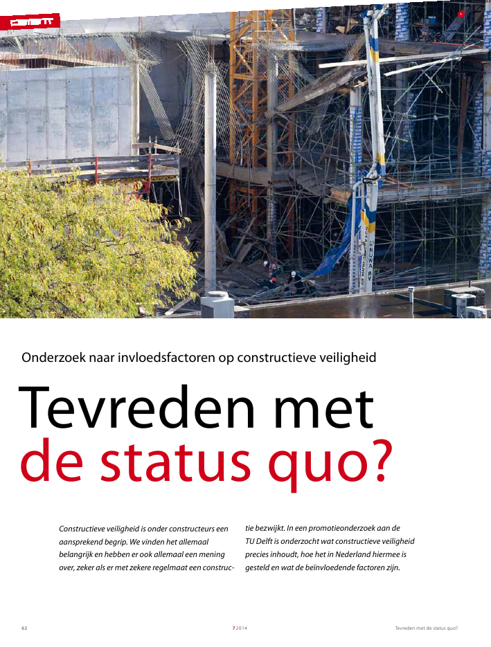 Constructieve veiligheid is onder constructeurs een aansprekend begrip. We vinden het allemaal belangrijk en hebben er ook allemaal een mening over, zeker als er met zekere regelmaat een constructie bezwijkt. In een promotieonderzoek aan de TU Delft is onderzocht wat constructieve veiligheid precies inhoudt, hoe het in Nederland hiermee is gesteld en wat de beïnvloedende factoren zijn. Auteur:dr.ir. Karel Terwel (TU Delft, fac. CiTG/ Coenraedt b.v.)