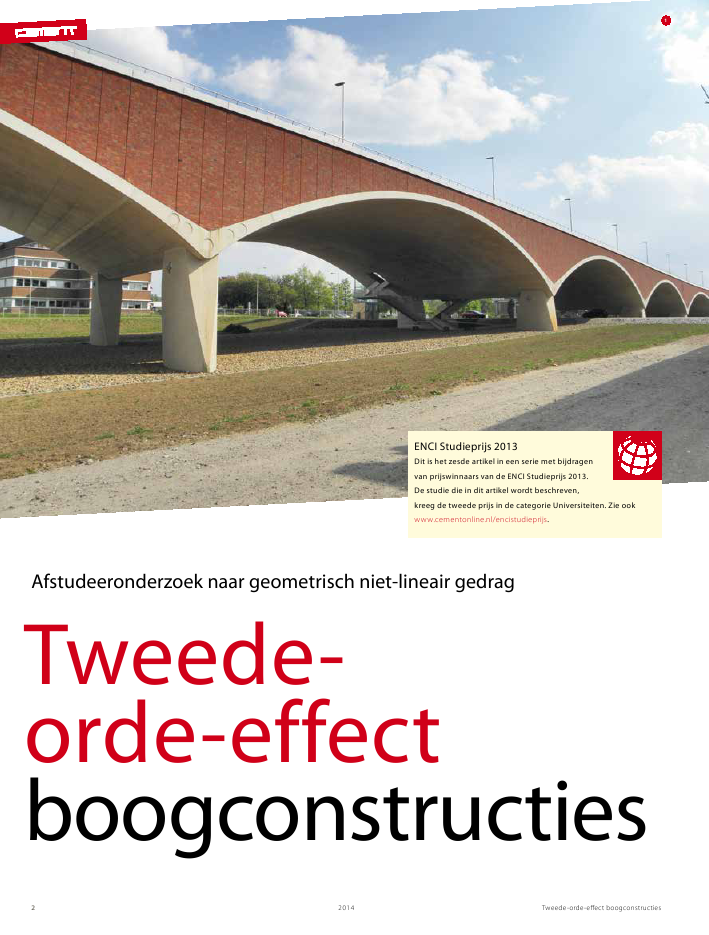 Boogconstructies worden ontworpen om belasting af te dragen via normaalkrachten. Er moet echter ook altijd op buigende momenten worden gerekend. Bijvoorbeeld als de boogvorm en de druklijn niet samenvallen, door de invloed van de stijfheid van de steunpunten of als gevolg van elastische verkorting. In alle gevallen zullen normaalkracht en buiging leiden tot geometrisch niet-lineair gedrag van de boogconstructie, ook bekend als het tweede-orde-effect. Voor kolommen kan dit effect goed worden benaderd op basis van de factor n ⁄(n-1), die is gerelateerd aan de Eulerse knikkracht. In een afstudeeronderzoek aan de TU Delft is het geometrisch niet-lineaire gedrag in boogconstructies onderzocht. Aanleiding voor het onderzoek was het ontwerp van Stadsbrug Nijmegen. Auteur:ir. Ruben Onstein (BAM Infraconsult) ENCI Studieprijs 2013Dit is het zesde artikel in een serie met bijdragen van prijswinnaars van de ENCI Studieprijs 2013. De studie die in dit artikel wordt beschreven, kreeg de tweede prijs in de categorie Universiteiten. Bekijk ook het afstudeerrapport.