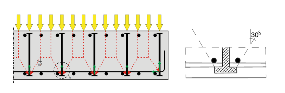Er bestaat de nodige discussie hoe je dit type staven moet detailleren en dimensioneren. De werking kan worden beschouwd conform de vakwerkanalogie, met trek- en drukstaven en knooppunten. De krachten in die knopen moeten in evenwicht zijn. Om daaraan te kunnen voldoen, moet de buigwapening liggen in het invloedsgebied van de ankerkop (fig. 2), zo werd gesteld in het Cement-artikel ‘Kopdeuvels als dwarskrachtwapening’ uit 2011 (auteurs Paul Teeuwen en Joost Walraven). De werking hangt daarbij dus sterk af van de positie van de koppen van de deuvelstaven.